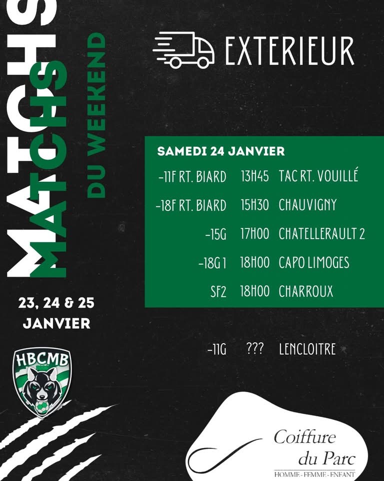 MATCHS DU WEEKEND – 24/25 JANVActualités / Par President_HBCMB MATCHS DU WEEKEND - 24/25 JANV Matchs du week-end!Venez nombreux encourager vos équipes ! Nous sommes encore dans l’attente de l’horaire pour le match des -11G, nous vous tiendrons informés.