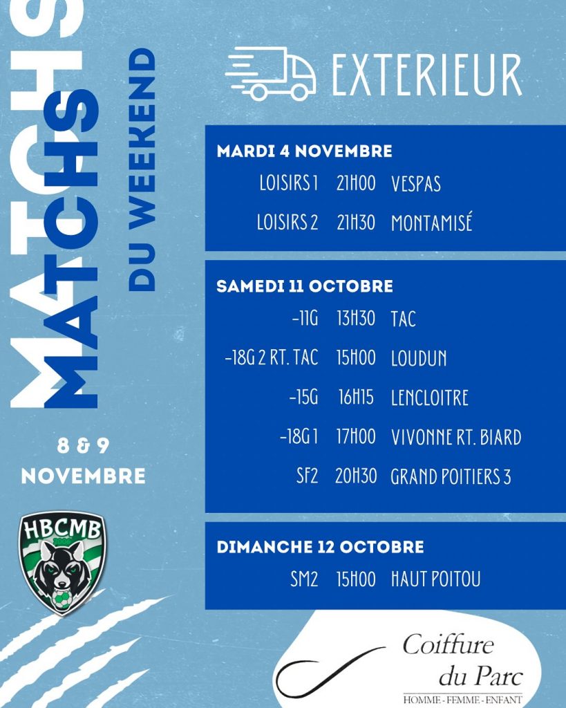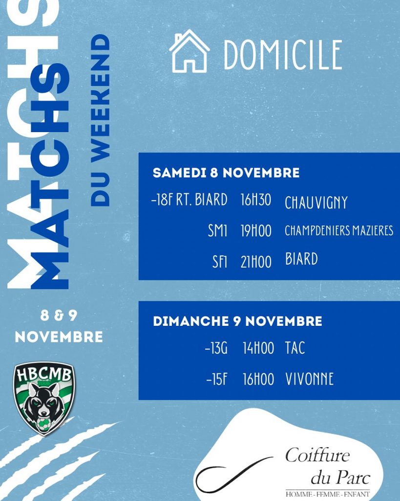 MATCHS DU WEEKEND – 8/9 NOV 25Actualités / Par President_HBCMB MATCHS DU WEEKEND - 8/9 NOV 25 Matchs du week-end ! De retour à domicile !Le gymnase de Mignaloux a réouvert ses portes alors on vous attend nombreux pour encourager vos équipes et faire du bruit dans les tribunes